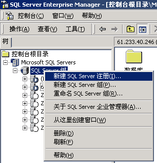2、点SQL server 组右键,选择新建SQL server 注册,如下图: