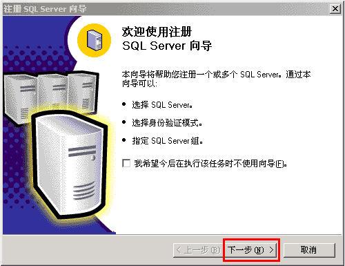3、弹出SQL server 注册向导,点下一步,如下图: