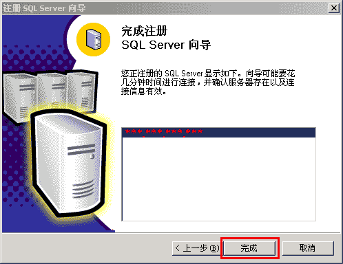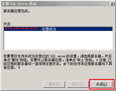 9、显示注册成功。(如果总是提示失败,请检查您的局域网是否开放了1433端口, 同时检查您的SQL链接超时时间,SQL默认超时时间为4秒,建议改成60秒---在SQL server 企业管理器=>工具=>选项=>高级。)